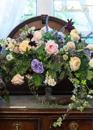 大輪でゴージャス感あふれる花材を、ダイナミックにかつエレガントにアレンジしていただきました。