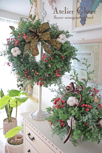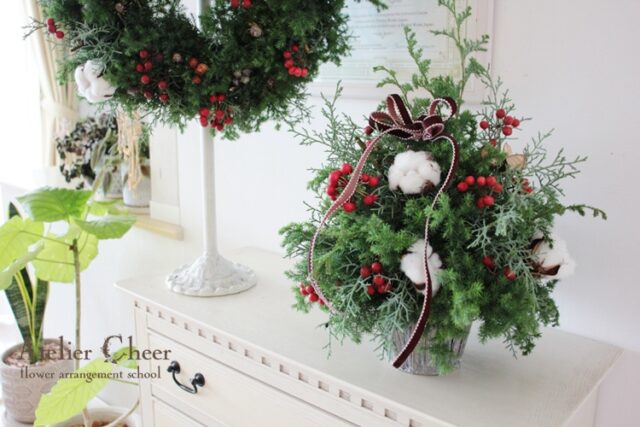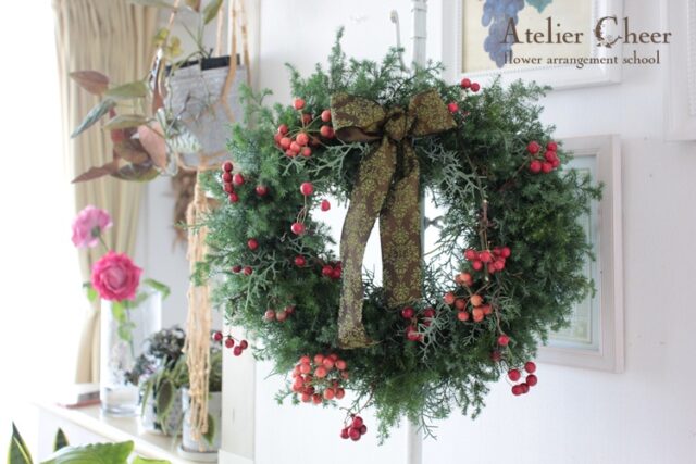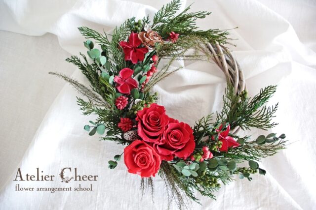 月に1回、プリザーブドフラワーのレッスンを受講の生徒さんのクリスマスリースです。