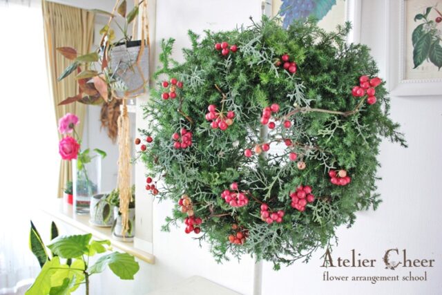 アトリエチアーのクリスマスのレッスンは、数種類の針葉樹をたっぷり使います。
